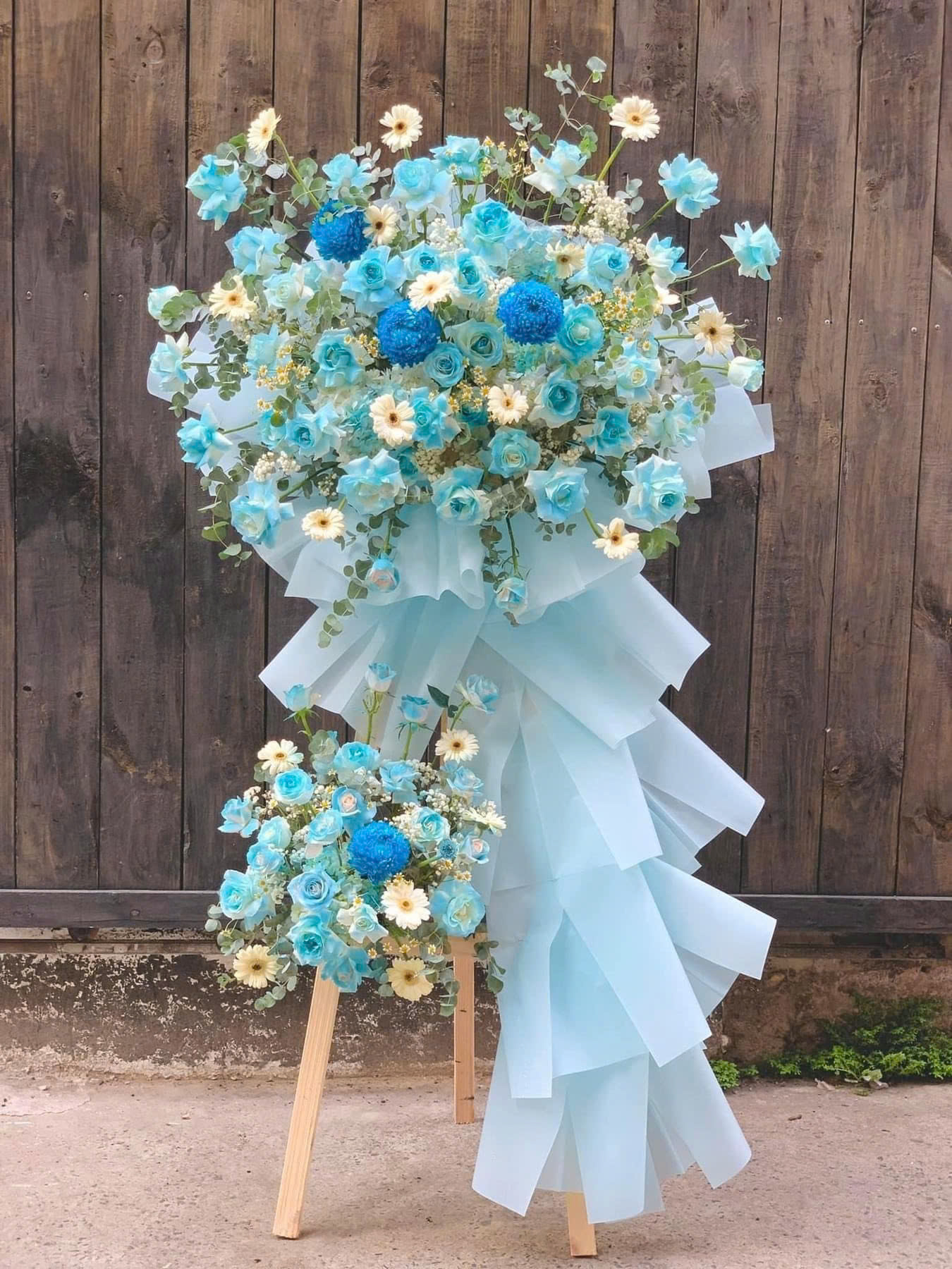 Kệ hoa được thiết kế 2 tầng thanh thoát, kết hợp các loại hoa gam xanh – trắng hài hòa, tạo cảm giác tươi mới và sang trọng. Tổng thể mang vẻ đẹp dịu mắt nhưng vẫn đủ nổi bật trong không gian trưng bày.